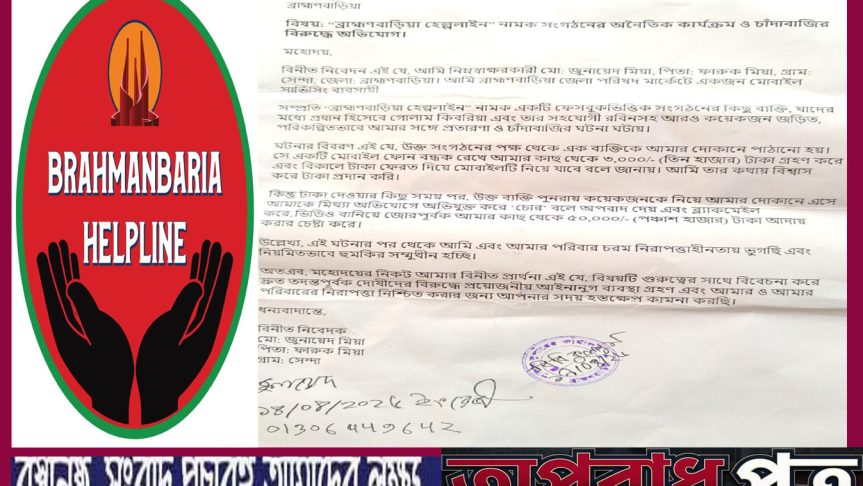 ব্রাহ্মণবাড়িয়ায় “ব্রাহ্মণবাড়িয়া হেল্পলাইন” নামের একটি সামাজিক সংগঠনের বিরুদ্ধে প্রতারণা, চাঁদাবাজি ও হয়রানির অভিযোগে প্রশাসন বরাবর লিখিত আবেদন করেছেন এক ব্যবসায়ী। অভিযোগটি ঘিরে জনসাধারণের মধ্যে চাঞ্চল্যের সৃষ্টি হয়েছে।
